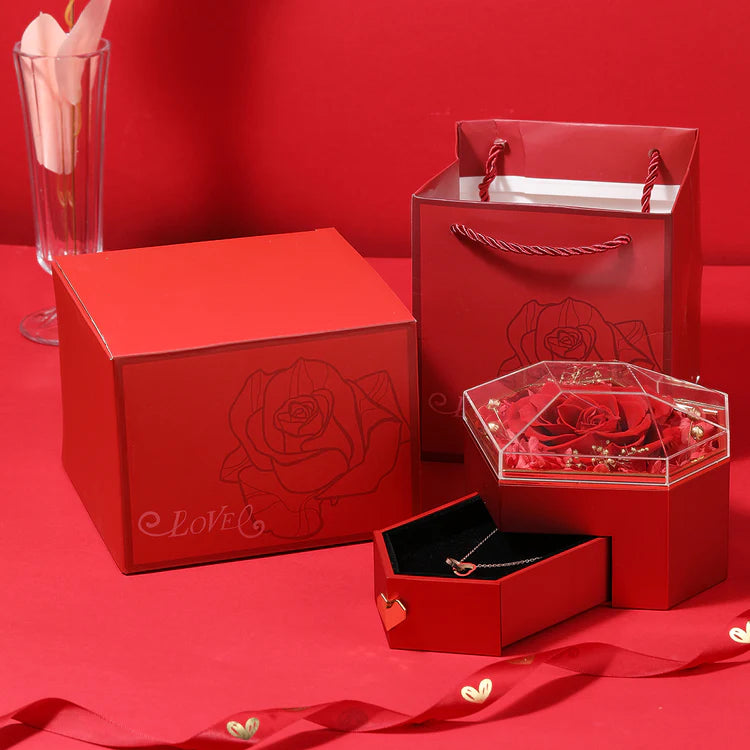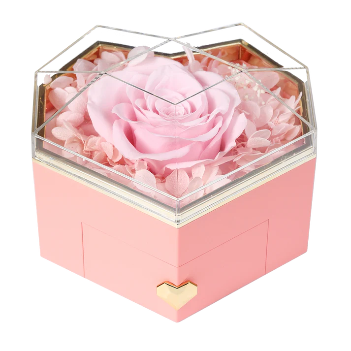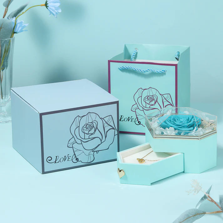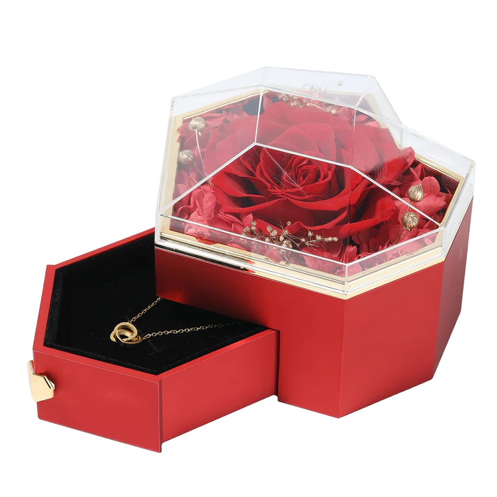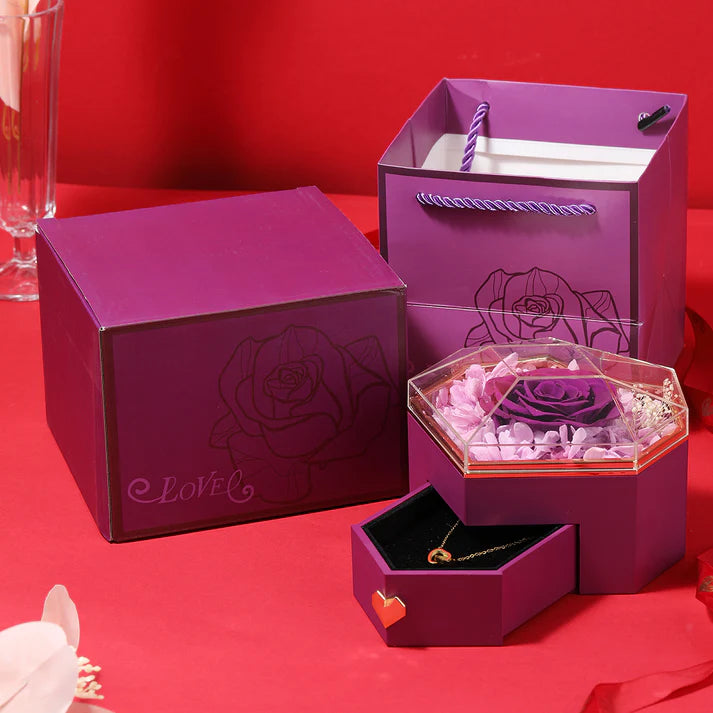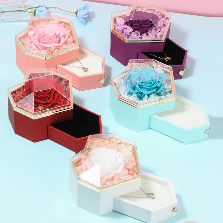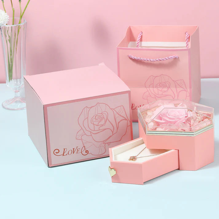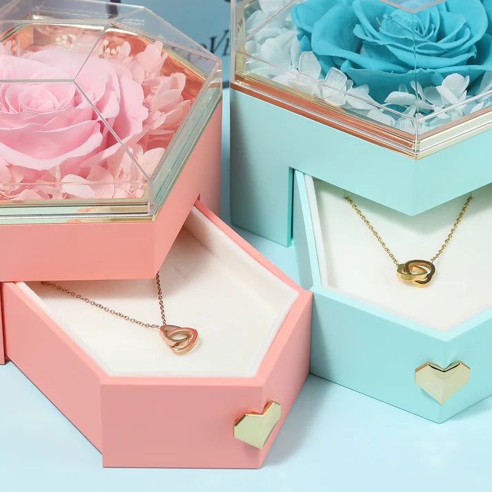 Discover our eternal pink box, a gift that fuses the eternity of a preserved rose with the timeless elegance of a sterling silver necklace. The rose, kept for three years, symbolizes an enduring love, while the 925 Silver necklace, adorned with two intricate hearts, can be personalized with a unique engraving.